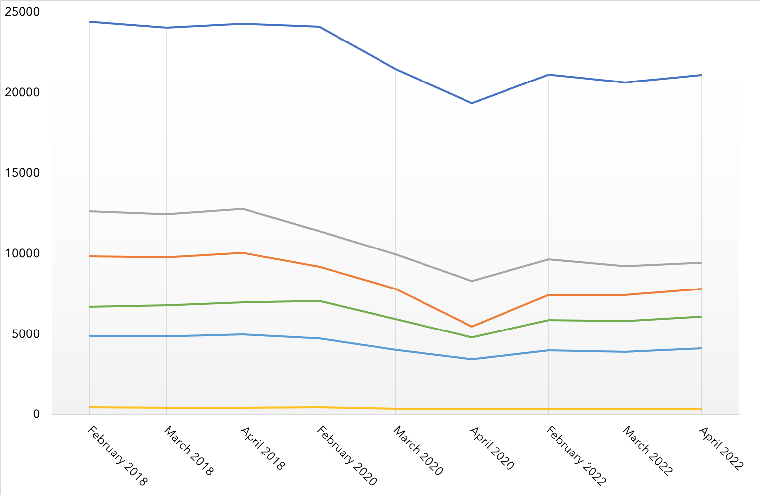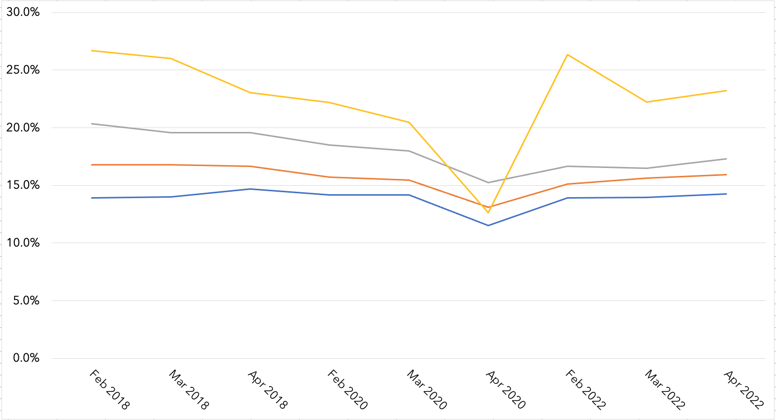 - Order of Percentage loss for each group between February 2018 and April 2020.